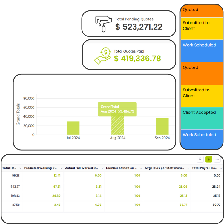 Get a complete overview of your quoting progress with built-in status management and tracking tools. Monitor every stage — from new quotes to approved and completed jobs — while keeping tabs on total hours worked and payments received. Instantly see what’s been paid, what’s pending, and where each job stands, all in one simple dashboard.
