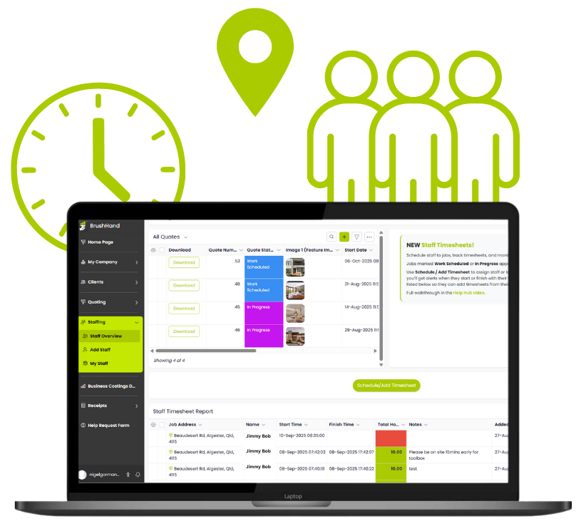 The Staff Portal gives your team a central hub to stay organised and accountable. Staff can easily submit timesheets from a list of jobs that are in progress or work scheduled, submit their timesheets directly through the portal, and have their work hours automatically linked to each job. Each timesheet submission is location-tracked for accuracy and transparency, while seamless integration with your quotes and business dashboard allows you to compare hours worked against hours quoted. Helping you manage productivity, costs, and job performance in real time.